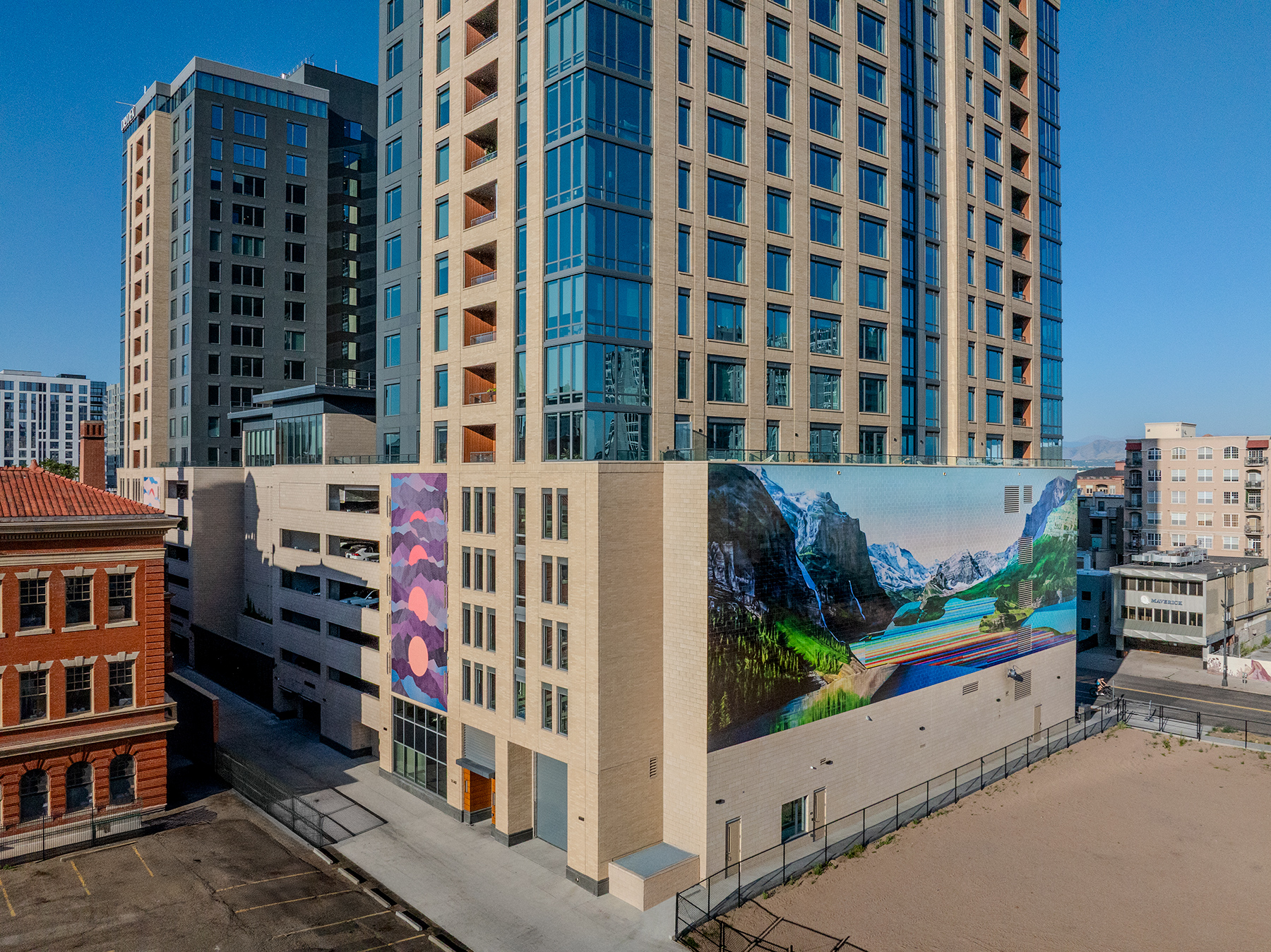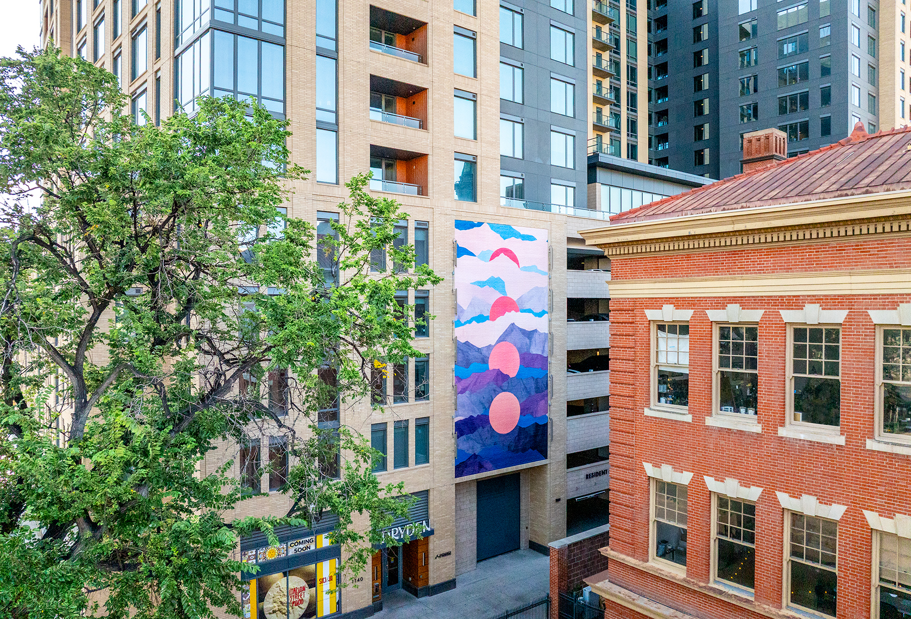 The exterior murals on the east and north façades of Dryden Apartments are a defining expression of luxury living in Denver’s Golden Triangle. Thoughtfully commissioned as part of a comprehensive art program, these works reflect the building’s commitment to community, wellness, and creative expression.